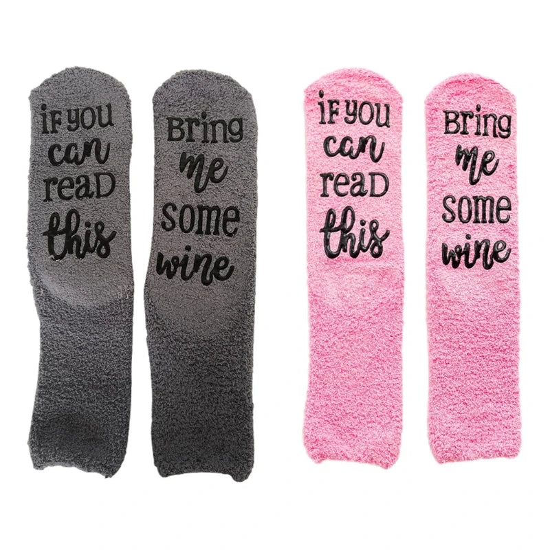 Women Winter Fuzzy Plush Slipper Crew Socks If You Can Read This Bring Me Some Wine Phrase Warm Hosiery Funny Gifts with Cupcake